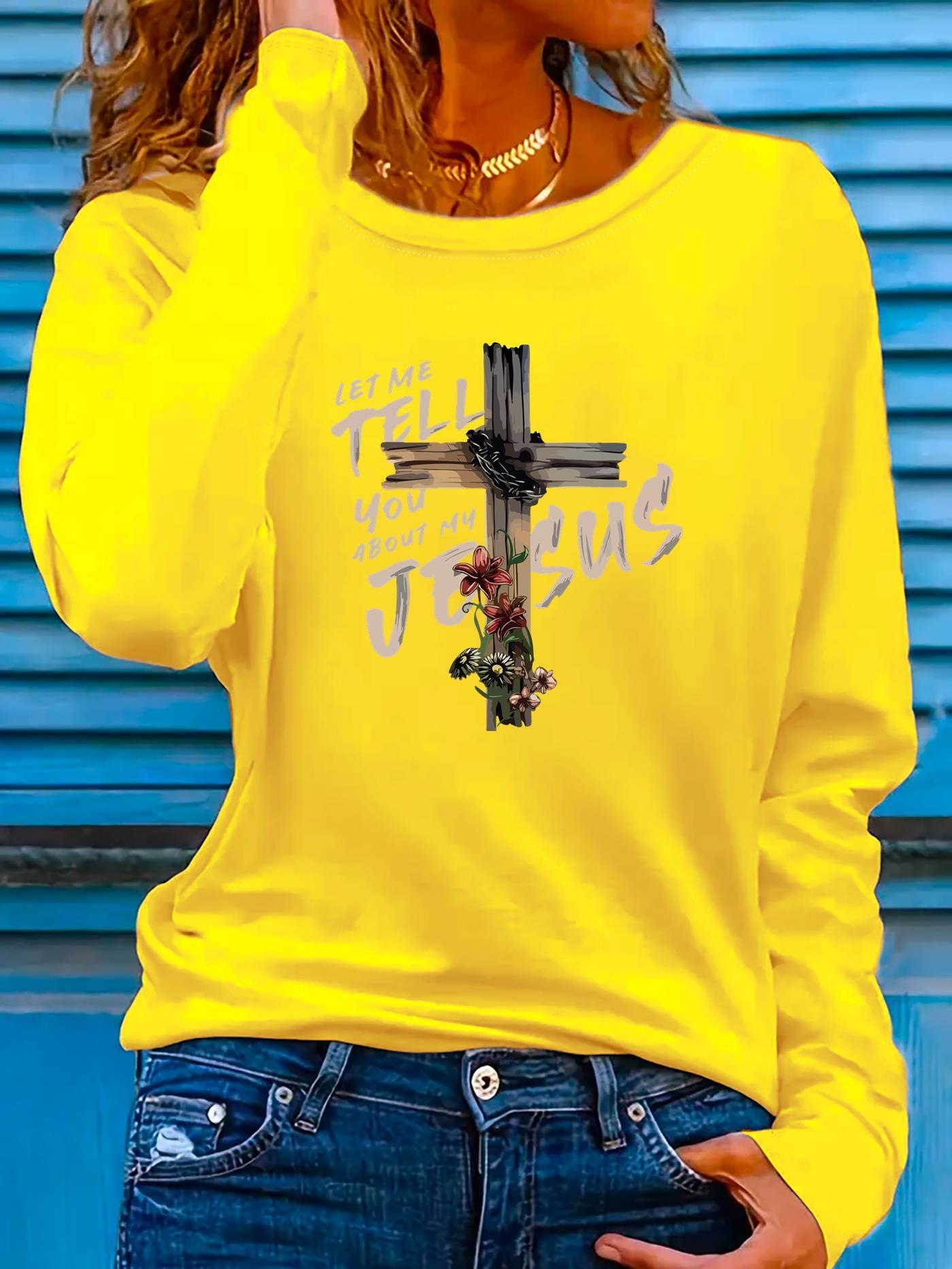 Floral Cross Print Women's Long Sleeve Crew Neck T-Shirt - "Let Me Tell You About My Jesus" Design, Soft Polyester Fabric, Machine Washable, Perfect for Casual Wear, Spring & Summer Outfits, Casual Wear Tee | Soft Texture Tee