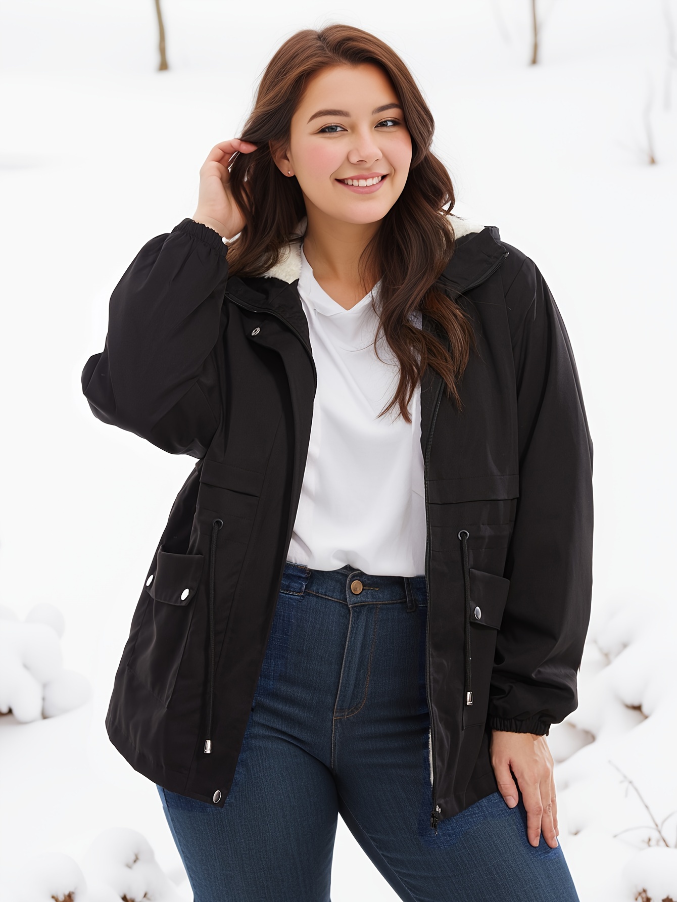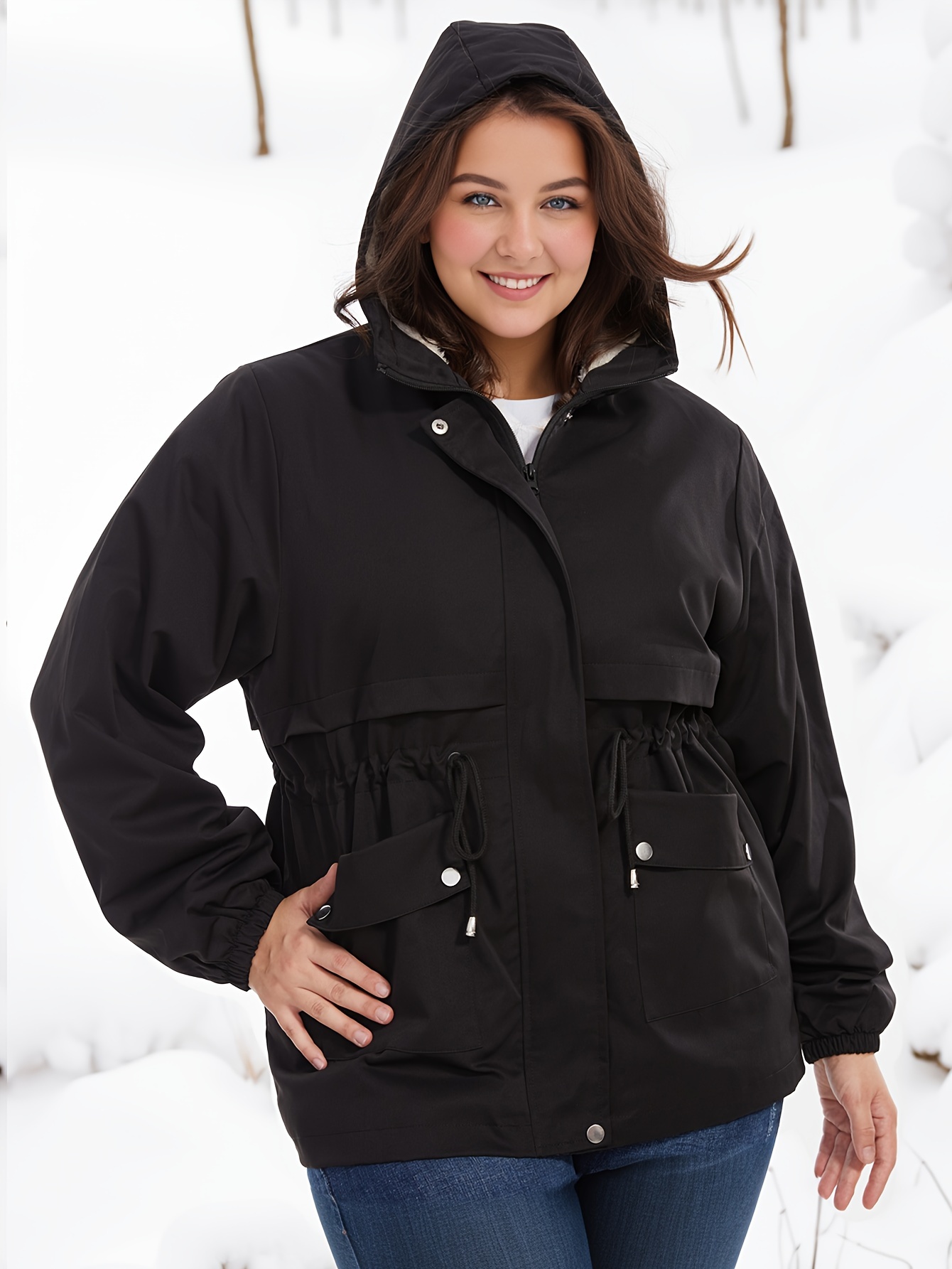 Women'S Plus Size Winter Coat, Long Sleeve, Solid Color, Polyester, Hooded, Casual Style, Open Front, Woven, A-Line Hem, No Belt, Regular Fit, Non-Waterproof