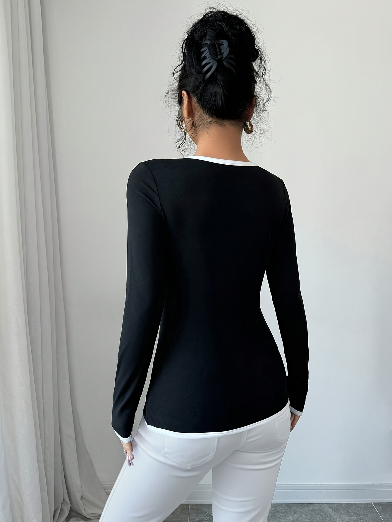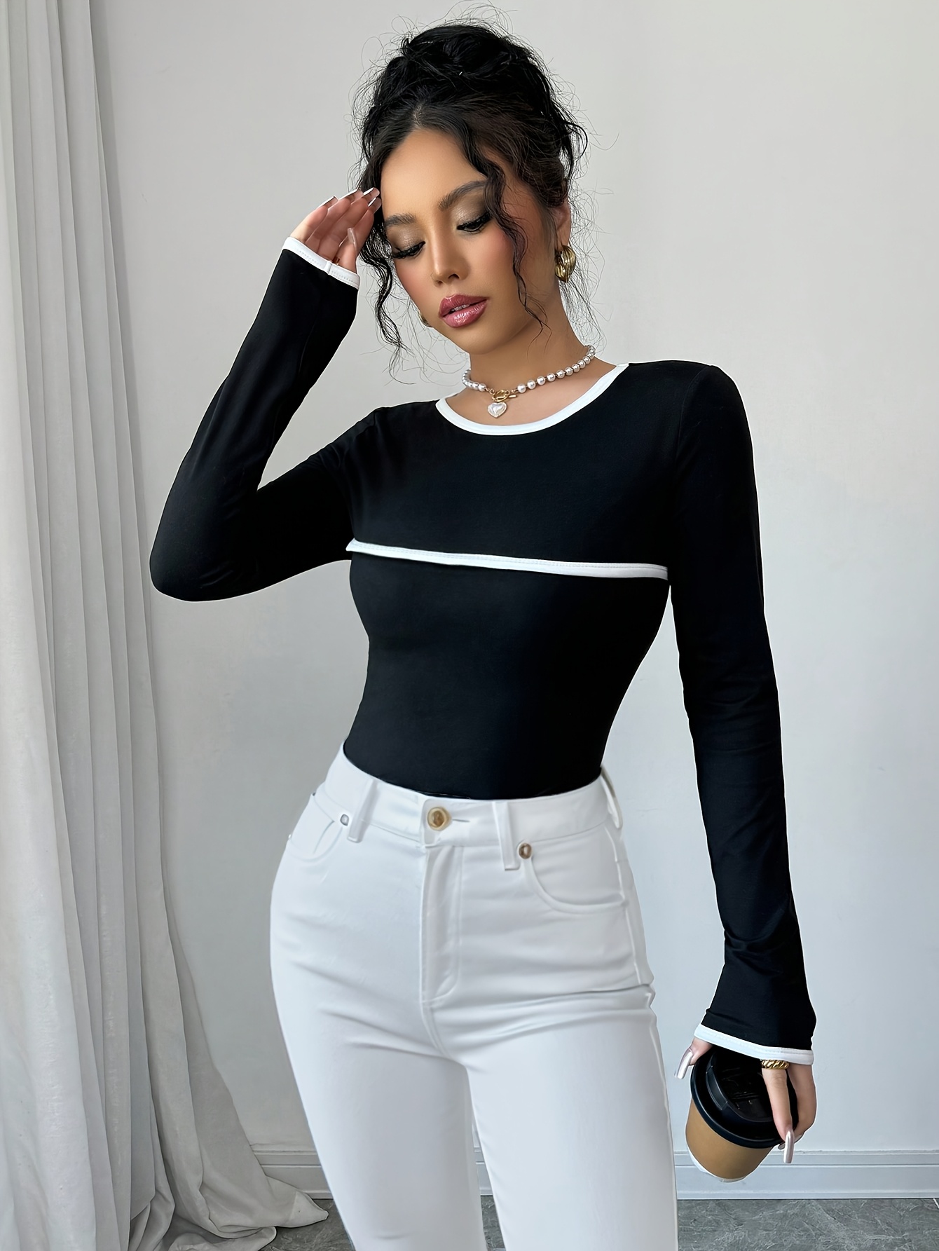 Women'S Elegant Casual Long Sleeve T-Shirt - Slim Fit, Round Neck, Solid Black with White Striped Detail, Stretchy Polyester Blend, Machine Washable, All-Season Comfort