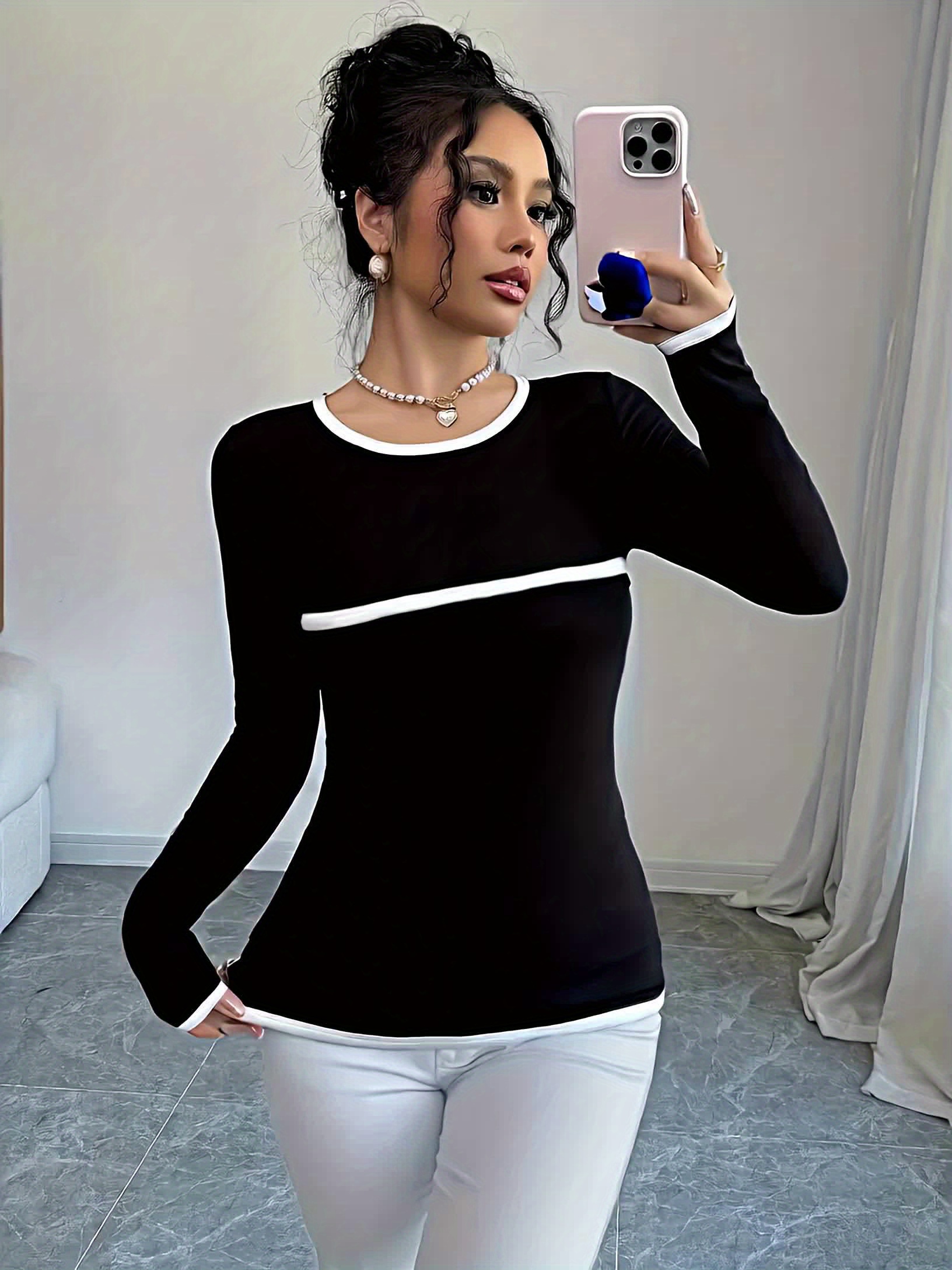 Women'S Elegant Casual Long Sleeve T-Shirt - Slim Fit, Round Neck, Solid Black with White Striped Detail, Stretchy Polyester Blend, Machine Washable, All-Season Comfort